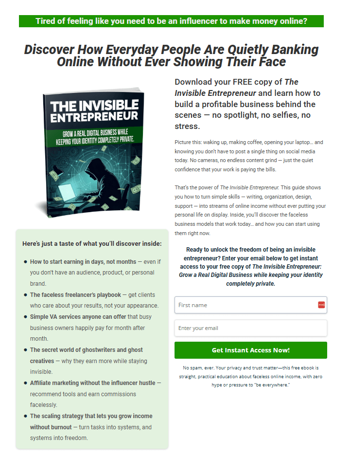 It speaks to founders, solopreneurs, coaches, agency owners, and course creators who care deeply about privacy, dislike turning their personal lives into marketing, and want their business results to speak louder than their faces ever could. These entrepreneurs are happy to build systems, serve clients, and make money—so long as they can stay off the stage and out of the spotlight.